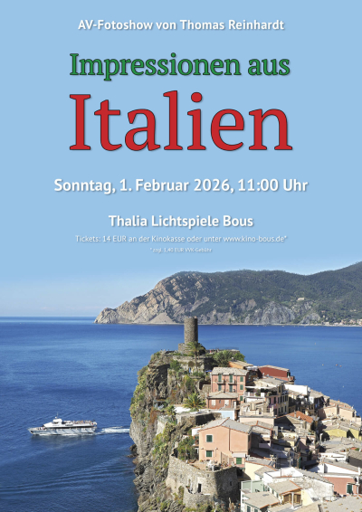 Wir laden Sie ein zu einer Reise durch Bella Italia. Los geht es ganz im Norden, in Südirol. Über den Gardasee erreichen wir die Cinque Terre in Ligurien. Dann folgen zwei prächtige Inseln: Sardinien und Sizilien. Italienische Impressionen heißt die AV-Fotoschau von Thomas Reinhardt mit Live-Kommentar und mit spannender Musik italienischer Bands.