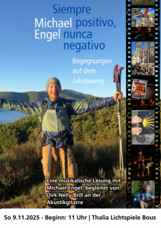 Der Camino frances, der französische Jakobsweg, beginnt in Saint-Jean-Pied-de-Port in den französischen Pyrenäen und endet nach 800 Kilometern in Santiago de Compostela. Auch Michael Engel hat sich den Camino erobert. Sein Buch ist jedoch weder ein Wanderführer noch eine Routenbeschreibung. Er schildert uns seine Begegnungen mit Gleichgesinnten aus aller Welt und lässt uns hautnah an seinen Erfahrungen und Erlebnissen teilhaben.Michael ergänzt das Buch mit seiner Camino-Playlist. Jeder Tag, jede Etappe wird bereichert durch ein ganz besonderes Musikstück! Neben dem Buch und Fotos des Weges hat Michael Engel auch einen musikalischen Wegbegleiter mit im Gepäck. Der Zweibrücker Dirk Nelly Brill begleitet mit seiner Akustikgitarre durch den Vormittag und interpretiert verschiedene Songs der Camino-Playlist. Für weitere Infos den Titel anwählen!